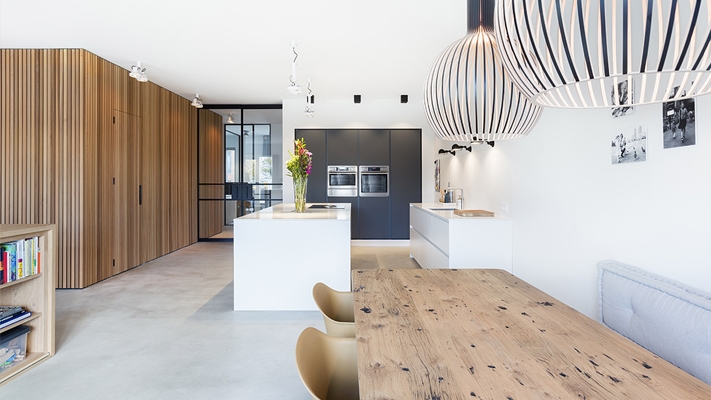 Door een aantal functies (badkamer, berging, laundry) op slimme wijze te clusteren en te verpakken in een bijzonder houten volume ontstond een functionele eyecatcher in de woning. Het houten volume van Western red cedar latten en de lichtgrijze microtopping vloer zorgen voor een rustig en warm kleurenpalet. Samen met de zwarte stalen puien en de strakke Italiaanse keuken ontstaat er een woning met karakter.