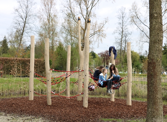 Loop je het park binnen, dan valt de hoge houten boomhut als eerste op. Kinderen kunnen hier naar hartenlust klimmen, klauteren en ravotten. De waterspeelplek nodigt op warme dagen uit om in en rond het water te spelen. Via een wandelpad met stapstenen kom je bij het speeleiland. Vlakbij het theehuis liggen de trampolines.