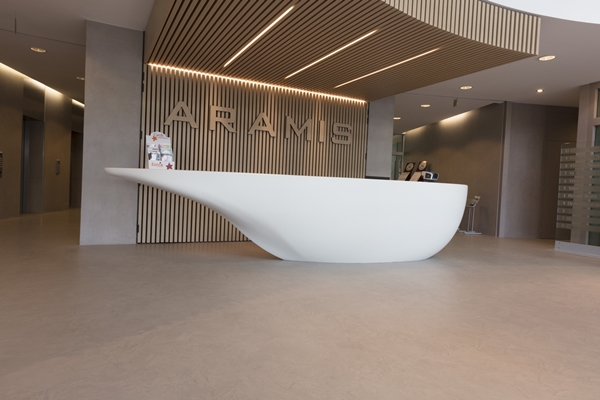 Wie de entree van Aramis binnenloopt, wordt onmiddellijk gepakt door de strakke vormen en inrichting, waarvan de wanden en vloeren in BetonDesign het fraaie decor vormen. ‘Project Aramis is voor ons een mooie real life showroom’, zegt Hugo. ‘BetonDesign komt het best tot zijn recht in mooie grote oppervlakken zoals hier.’ Intussen zijn er in België 40 BetonDesign-dealers, waaronder Rénovadécor, die allemaal de training via Forbo Flooring België hebben gevolgd. De marktintroductie van BetonDesign voor België en Luxemburg deed Hugo Steppe in 2016 in nauwe samenwerking met Robert van der Laan, Sales Manager Export bij Forbo Eurocol in Nederland. Verkoop en ondersteuning voor België en Luxemburg wordt verzorg door Forbo Flooring België.