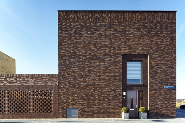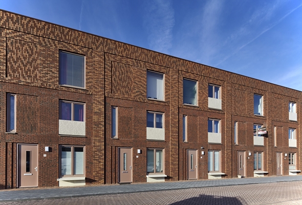 De hoeken van het bouwblok zijn traditioneel gemetseld. Dat heeft alles te maken met het programma, aldus Jan Klomp: “Aanvankelijk zouden in het Loungekwartier appartementen komen. Maar door de crisis in de bouw veranderde dat. Het blok kreeg een iets te licht programma van 36 eengezinswoningen. Wij moesten het Loungekwartier binnen het stedenbouwkundig stramien echter wel als een robuust volume neerzetten en ook de hoeken kloek maken– al bevindt zich daar maar één enkele eengezinswoning. Dat vroeg om stevige gesloten hoekpartijen. Traditioneel metselwerk leende zich hiervoor het beste, gezien de grote gevelvlakken.”