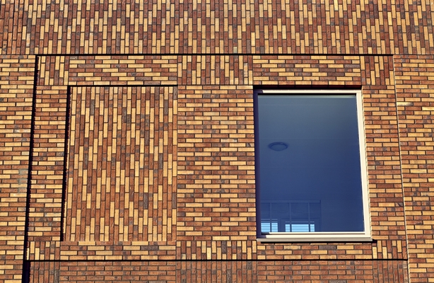 Aan het binnenhof is een gele gevelsteen van Wienerberger toegepast. Jan Klomp: “Hier wilden we een interieurkwaliteit realiseren, compleet met omsloten groen buitenterrein. Je kunt de Hagemeistersortering “Gent” zien als de schil van de appel, de gele steen als het vruchtvlees onder de schil.”
