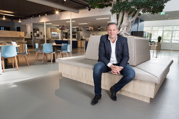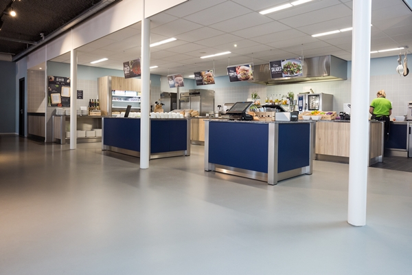 ‘De opdrachtgever wilde de vloer van het VDL-bedrijfsrestaurant aanvankelijk afwerken met marmoleum of een traditionele gietvloer’, vertelt Wilfred Koek, ‘totdat Technisch-commercieel adviseur Ruud Vaessen de architect de LiquidDesign-stalen toonde. Daar was hij direct enthousiast over. Vooral het strakke, naadloze resultaat sprak hem bijzonder aan, naast de warme uitstraling en geluiddempende eigenschappen. Twee projectinrichters deden vervolgens offerte en wij kregen de order, mede omdat wij hier in Almelo ‘om de hoek’ gevestigd zijn. Die korte lijnen zijn prettig voor de klant.’