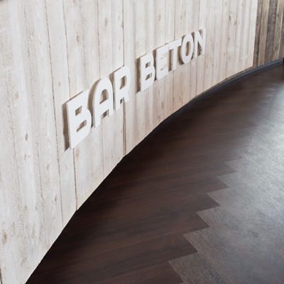 De vloer die er in ligt is een warme tegenhanger van het beton. Er is gekozen voor Expona, een 2,5 mm dikke PVC vloer die uit ‘planken’ opgebouwd wordt. Voordeel daarvan is dat de vloer ook in visgraat gelegd kan worden, wat in dit geval de uitstraling van een luxe klassieke houten vloer versterkt. De houtprint met een diepe, warme tint geeft de impressie van walnotenhout. Zo vormt de vloer een stijlvolle basis voor het interieur en is praktisch en akoestisch de perfecte vloeroplossing voor dit drukbezochte horeca lokaal.