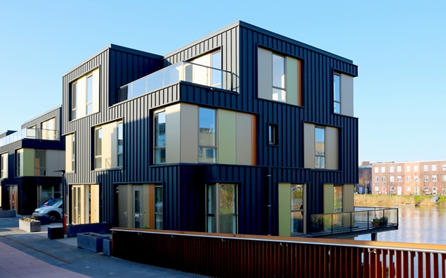 Het visuele karakter van de woningen in de Zeeburgerbaai wordt bepaald door een innovatief gevelconcept. De architecten kozen voor een gelaagde opbouw waarbij de aluminiumbasis van de woningen is voorzien van een karakteristieke tweede huid. Deze buitenste schil is gerealiseerd met Trespa® Meteon® Metallics-gevelbekleding. Hoewel in de vroege ontwerpfase nog werd gedacht aan een witte afwerking, viel de uiteindelijke keuze op een palet van metallic-kleuren. Deze beslissing werd gedreven door de zoektocht naar een duurzaam materiaal met een bewezen staat van dienst en een uitstraling die de dynamiek van de omgeving weerspiegelt.