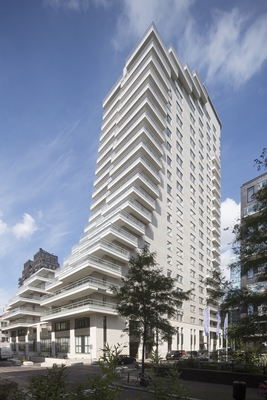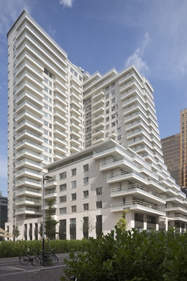 Samen met de architecten van Inbo ontwikkelde Hagemeister voor dit luxe woongebouw een chique sortering op maat: de „Intermezzo“, licht van kleur, met de uitstraling van natuursteen en voorzien van een karakteristiek handslagreliëf. De „Intermezzo" is in het gebouw in twee formaten toegepast: 240 x 115 x 70 mm (traditioneel metselwerk) en 240 x 30 x 70 mm (steenstrips voor de prefab geveldelen).