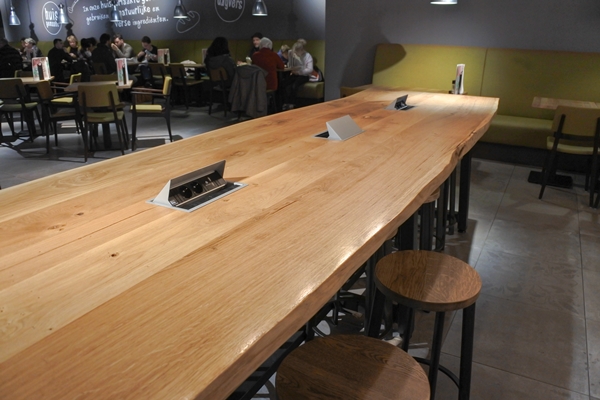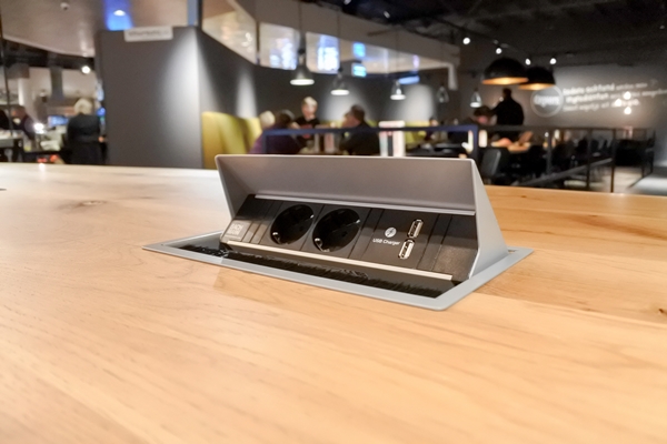 tafelunits geleverd. Deze stijlvolle inbouw tafelunit is in de verschillende tafels van de restaurants gemonteerd. Zo kunnen de bezoekers van het restaurant tijdens het drinken van een kopje koffie of het eten van een maaltijd hun laptop of smartphone opladen en zo rustig verder werken. Flexwerken ten top!