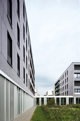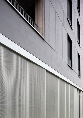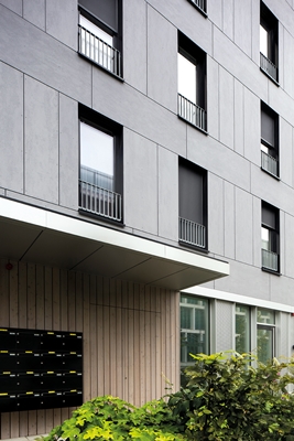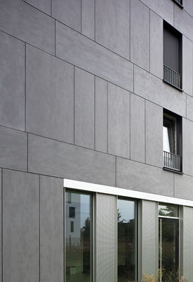 Dankzij dit materiaal hebben de architecten het lijstwerk van de gebouwen op een verzorgde wijze kunnen schikken zodat de architectuur van de volumes tot haar recht komt. Om de gevels te ritmeren hebben ze gekozen voor horizontale elementen voor de stroken met vensters en verticale elementen tussen de vensteropeningen. De textuur van het EQUITONE [tectiva] paneel laat veranderende kleureffecten toe naargelang de richting waarin de panelen zijn geplaatst en het licht.