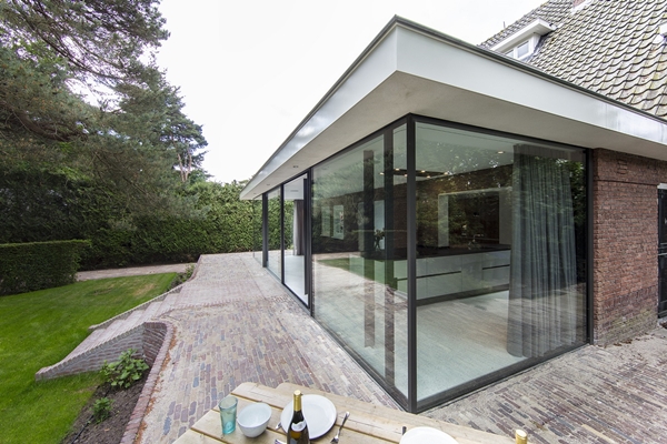 Voor de transformatie van de villa in Bilthoven kreeg de architect een specifieke opdracht. Betrek de tuin, die op het noorden is gelegen, zoveel mogelijk bij het huis en creëer een woonkeuken dat het hart van het huis kan worden. Die tweeledige wens bracht Hekkert op het idee van een glazen gevel die de achterzijde van het huis volledig omarmd. “De strakke, glazen pui doet recht aan de statigheid van het huis. Het ontwerp is subtiel, op het minimalistische af, maar voegt duidelijk wel karakter toe aan de villa”, motiveert Hekkert. Toch is de constructie vooral functioneel. De serre realiseert een natuurlijke en naadloze verbinding tussen huis en tuin en creëert tegelijkertijd een riante woonkeuken. Die past perfect bij de hedendaagse manier van leven, zegt Hekkert. “Mensen brengen steeds minder tijd door in hun huiskamer. De woonkeuken is dé plek waar men tegenwoordig lang borrelt, eet en verblijft.”
