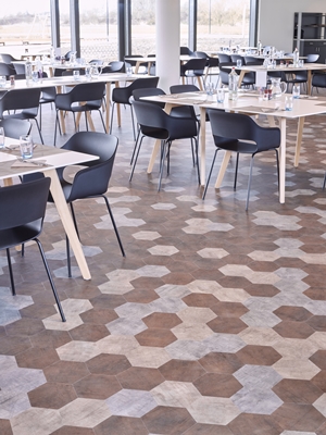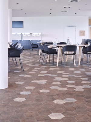 “Door de combinatie van verschillende kleuren valt vuil minder snel op. De basiscollectie bevatte twee kleuren die we graag wilden combineren met een derde metaaltint die enkel verkrijgbaar was in een andere collectie. De inventieve en flexibele dessin- en kleurenontwerpers van Moduleo zorgden voor een driekleurige Moods-vloer in hexagonvorm.”