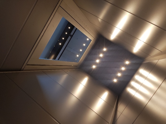 De lift is een basis uitvoering met een dichte schacht in de kleur RAL-9006, een met LED verlicht plafond en bedienings-element en voorzien van deuren met glas-inleg. Ondanks de standaard uitvoering is de lift een zeer mooie mix tussen functionaliteit en een exclusieve uitstraling geworden in het midden van de zaak.