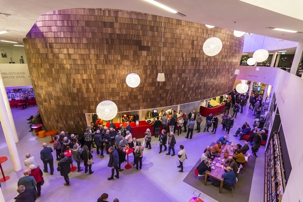 Bij het betreden van de publieke foyer ervaren bezoekers meteen de bolvorm van de theaterzaal. De bouwmassa van de theaterzaal is losgekoppeld van de verdiepingen. De hoge vide met daklichten benadrukt de zaal nog eens extra. De bekleding bestaat uit houten shingles van verzaagde oude meerpalen. Dit is het hart van het gebouw waar het publiek elkaar ontmoet en napraat over de voorstelling. De ruimte voelt spannend aan door de dynamische manier waarop de zaal in het gebouw is gesitueerd. Vooral de weerkaatsing van het daglicht op het hout doet overdag het hele gebouw gloeien. ’s Avonds wordt de sfeer in de foyer bepaald door de intensiteit en de kleur van het kunstlicht. Zo is de ruimtesfeer eenvoudig aan te passen voor een klassiek muziekstuk of juist een popconcert. Dit maakt de beleving van het programma een totaalbeleving.
