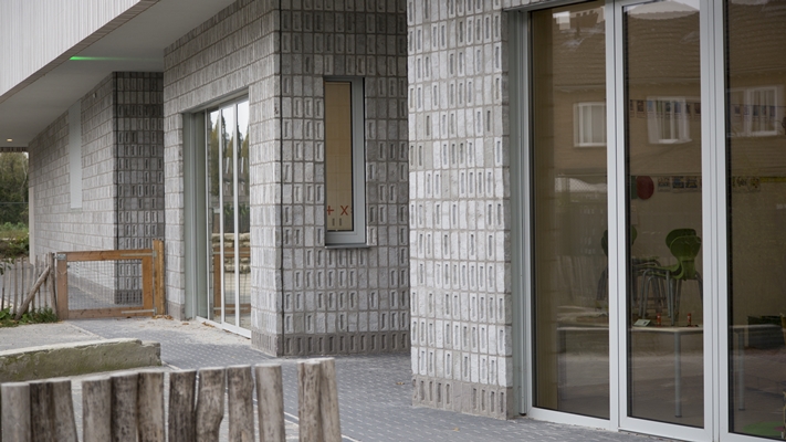 Grote glaspuien van Reynaers Aluminium, alle gemonteerd door P. van Hoesel, laten de buitenruimte visueel het gebouw inkomen. “Ik heb de vensters weggewerkt achter de gevelbekleding, zodat de openingen in de gevel maximaal doorzicht bieden.” Elk lokaal heeft openslaande deuren naar een buitenruimte. Op twee plekken is een lage pui (ca 1 meter hoog) toegepast: op de zuidhoek van de peuterspeelzaal, waar het zicht naar buiten vanuit de ooghoogte van de peuters prima is, maar wel de zon wordt geweerd. En in de gang naar de kleedkamers en de gymzaal, daar zijn van buitenaf alleen benen te zien van de mensen die er lopen.