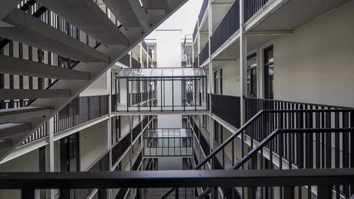 De binnenhof heeft galerijen rondom met stoere zwarte hekken tegen een witte achtergrond. De betonnen galerijvloeren zijn gevat in een strak wit stalen kader. āIk heb hier een al te strak ritme willen doorbreken door op de bovenste vier verdiepingen hier en daar de galerij te verbreden tot balkon. Ik hoop dat bewoners op mooie dagen hier in het zonnetje gaan zitten met elkaar. Daarnaast heb ik op twee verdiepingen dwars over de hof een kas ontworpen, waarin bewoners zelf planten in potten kunnen zetten. Dat bevordert de interactie tussen bewoners en verlevendigt het hofā, legt architect Verdonschot uit. In het midden van het hof komt binnenkort een lichtkunstwerk, dat kleuren projecteert op de witte liftschacht.
