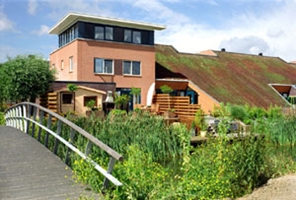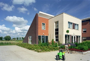 Functie De woningen zijn typologisch opgezet als 2 onder 1 kap woningen. De gevels zijn aan de stadszijde 3 lagen hoog, aan de weilandzijde is een 8 meter glooiend dak gemaakt met een mos-sedumbegroeïng. Ter plaatse van de garage en bijkeuken loopt dit dak door tot maaiveldniveau. Bij de eetkamer is een snede uit het dak gehaald. Hierdoor kan daglicht toetreden en ontstaat een ruim terras (met optionele steiger) aan het water met vrij uitzicht over het landschap.