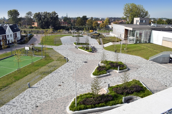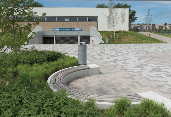 van Struyk Verwo Infra. De eilanden zijn zo gesitueerd dat zij de verschillende verkeerstromen naar de diverse entrees sturen. Binnen de betonnen parkbanden zijn inhammen gemaakt met een houten zitting, waardoor er op het grote plein ook kleinschalige ontmoetingsplekken zijn. ‘Met de beplanting van de eilanden en de bomen in de groene rand rondom het plein ziet het eruit zoals het bedacht is.’ Ook de manier waarop de scholieren omgaan met het plein stemt Ketner tevreden. ‘Er ligt geen afval op de grond en het oogt heel fris.’