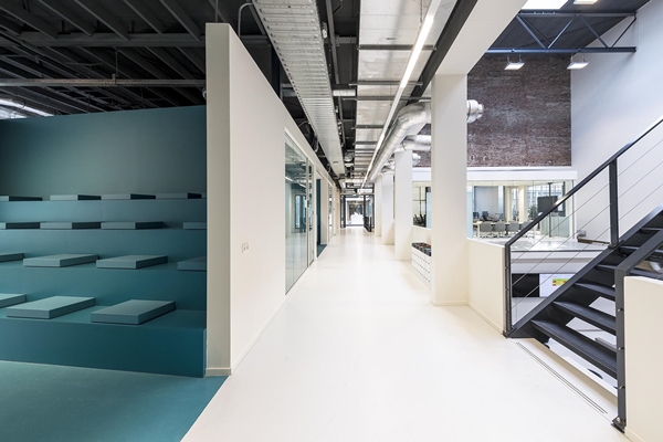 In het hart van het gebouw, nabij de atria, ligt de fun omgeving. Hier kunnen medewerkers en bezoekers even ontsnappen aan het kantoorleven. Er is ruimte om zowel collectief als individueel te ontspannen, dankzij spelelementen en informeel meubilair. Rond de fun area, waar ook voorzieningen als pantry en koffiecorner zijn gesitueerd, ligt de team work zone. Aan de buitengevel bestaat deze uit zogenaamde studio’s, creatieve ruimten waar teams van acht tot tien personen werken. Op de begane grond is hier een bestaande visgraat parketvloer hergebruikt. Antracietkleurige kasten met open vakken zorgen ervoor dat teams hun werkruimte kunnen personaliseren, om de team identiteit uit te dragen en de saamhorigheid te versterken. Meer gesloten ruimten, waarin een variatie aan werkplekken is gemaakt, vormen de overgang tussen de studio’s en de fun area. In dit gebied liggen overlegplekken, scrumplekken, belplekken en concentratiewerkplekken. Nabij de entree van het gebouw is de co-creation omgeving gesitueerd. Dit gebied bestaat uit een mix van open en gesloten ruimten voor formeel en informeel overleg. De layout is volledig flexibel dankzij multifunctioneel meubilair en verplaatsbare wanden.