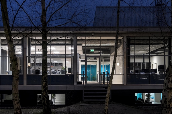 Het voormalige laboratoriumgebouw is voor de nieuwe functie intern volledig gestript. Centraal in het gebouw bevond zich over drie verdiepingen een zogenaamde ‘dode’ kamer, een ruimte rondom voorzien van schuimrubberen punten om geluid volledig te absorberen. In de nieuwe situatie is de dode kamer opengebroken en omgevormd tot een ruimtelijk atrium, dat daglicht diep in het gebouw brengt. Onder de schuimrubberen punten kwamen metselwerk muren tevoorschijn, die het atrium een bijzondere uitstraling geven. Nieuwe, stalen trappen verbinden de omliggende verdiepingen. Even verderop zorgt een tweede, kleiner atrium voor nog meer visuele verbinding tussen de verdiepingen. Rondom het gebouw zijn verschillende betonnen kelderlichten verwijderd en is het maaiveld omlaag getrokken. Dankzij de atria en het verlaagde maaiveld, komt er in de nieuwe situatie voldoende daglicht in het souterrain om het als werkomgeving te gebruiken.