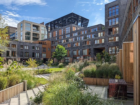 De opzet van het bouwblok rondom een gezamenlijke tuin, met opgetilde brede woonstraten waaraan de appartementen liggen zorgen voor sociale cohesie binnen het bouwblok.