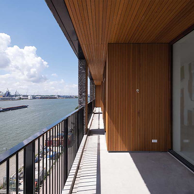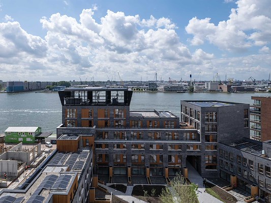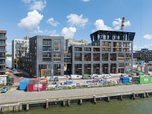De stadswoningen in de autoluwe tussenstraat zijn herkenbaar en worden vergezeld door een ‘custom made’ poortwoning die we samen met de kopers ontworpen. Als tegenhanger van de robuuste kade gevels is in het bouwblok een groene oase aanwezig, met privétuinen van de stadswoningen en een gemeenschappelijke binnentuin. De gestapelde maisonnette woningen zorgen voor bijzondere plattegronden voor een brede doelgroep, allen met een geweldig uitzicht.