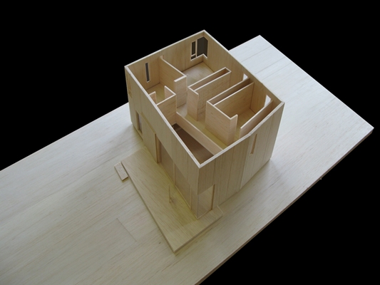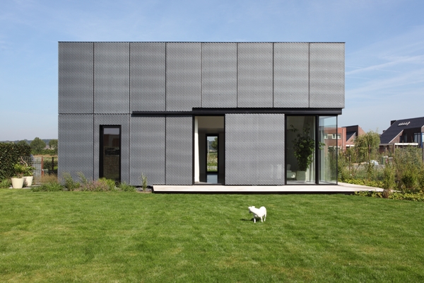 De buitengevel is opgebouwd uit aluminium, strekmetalen platen met een speciale coating die van kleur verandert door verschillende lichtomstandigheden. De aluminium kozijnen vormen scherpe uitsneden die de omgeving zorgvuldig inkaderen als grote dynamische schilderijen. De grondvorm van het huis wordt gevormd door het perceel; het is schuin aan de voorkant en loopt parallel met de straat. Het resultaat is een volume met een scherp uiterlijk dat een ruim en specifiek interieur creëert.