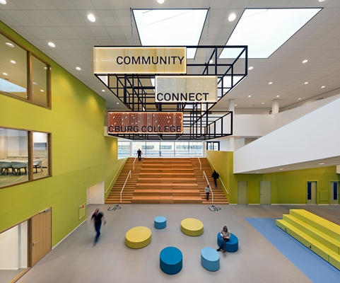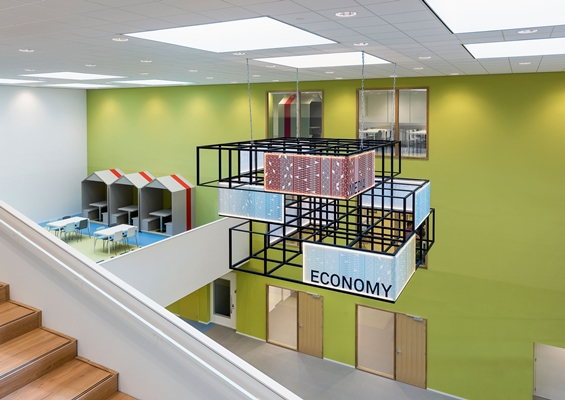 Het gebouw is gesitueerd op het Zeeburgereiland en heeft een grote centrale hal over 3 verdiepingen midden in het gebouw. De centrale hal is het kloppend hart van het gebouw. Aan de centrale hal grenzen de leerpleinen, de lokalen, de kantine, de overlegruimten, de teamlounge en beroepspleinen. Door het gebruik van kleur worden de verschillende ruimtes geaccentueerd. Dit geeft de leerlingen en docenten overzicht en oriëntatie. De centrale hal is de multifunctionele ruimte in het gebouw. Een plek voor leerlingen en docenten om elkaar te ontmoeten, te leren, te lunchen, te chillen en geschikt voor diverse bijeenkomsten en presentaties.