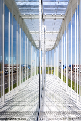 hebben in figuurlijke en letterlijke zin te maken met connectiviteit, verbindingen, communicatie en transparantie. Dit wordt niet alleen duidelijk gemaakt bij de eerste aanblik van het gebouw, maar ook in de gekozen locatie en in de ruimtelijke en interne organisatie. Alle bedrijfsprocessen zijn in een continue ontwikkelende ruimtelijke “flow” met elkaar verbonden. De routing eindigt in de demo-ruimte op de tweede verdieping die gebruikt gaat worden voor kennisoverdracht. Deze ruimte loopt weer over in het restaurant en vervolgens in de architectonisch geïntegreerde daktuin. Relaties komen via deze routing tijdens een bezoek langs alle bedrijfsprocessen die inhoud geven aan de identiteit van QNP. Het gebouw gaat een sterke relatie aan met de omgeving. Het transparante geluidsscherm van de HLS en de A16 vormt een decor waar het ontwerp op voort lijkt te borduren. Het is onze ambitie dat automobilisten en treinreizigers het gebouw gaan waarderen als herkenningspunt, daarmee geeft het een versterking aan de identiteit van de stad.