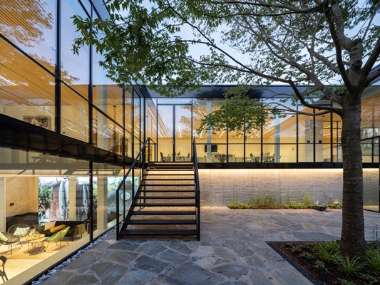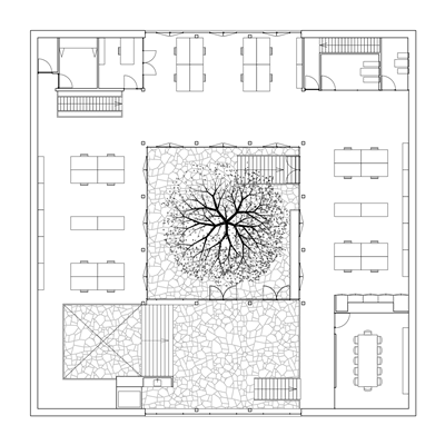 Barbecueën geschiedt buiten, daarom is de buitenruimte in samenhang met het gebouw ontworpen. Midden in het vierkant bevindt zich een eveneens vierkante patio. Deze is half verhoogd, zodat zowel de representatieve ruimtes op de begane grond, als de werkplekken op de verdieping direct verbonden zijn met deze zelf gecreëerde buitenwereld. De volwassen boom in het midden van de patio zorgt voor een aangename filtering van het licht.
