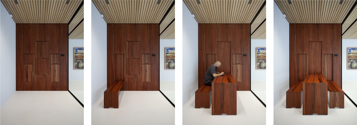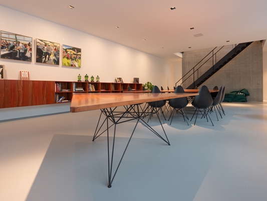 In het interieur is de vormgeving en inrichting van iedere ruimte afgestemd op het specifieke gebruik. Dit kan een formele ontvangst zijn, een groeps-brainstormsessie of een privé-telefoongesprek. De verschillende representatieve ruimtes volgen elkaar logischerwijs op, gaan in elkaar over en leiden uiteindelijk naar de buitenruimtes. Bij de afwerking zijn consequent natuurlijke, hoogwaardige materialen toegepast. Voorbeelden hiervan zijn de flagstone vloer die vanaf de hoofdentree doorloopt over de trap en de lounge tot in de patio en de vloer van travertin die de tuinkamer, het terras en de buitenkeuken tot een geheel maakt. Voor de meer besloten ruimtes in het gebouw, waar privégesprekken en -overleggen worden gevoerd, zijn speciale dynamische wandmeubels ontworpen en in de boardroom is een volledige wand bekleed met een vilten kunstwerk, waardoor niet alleen de sfeer maar ook de akoestiek prettig is. Voor klein overleg, een gezamenlijke lunch of de ontvangst van grote groepen is door Team Paul de Vroom + Sputnik een driehoekige tafel ontworpen, waarvan er zes geproduceerd zijn. De 60°tafel verenigt de intimiteit van een ronde tafel met de schakelbaarheid van een vierkant model.