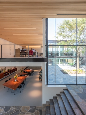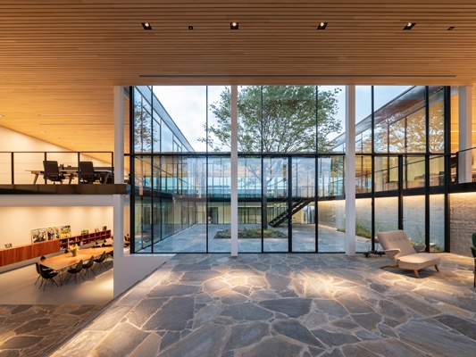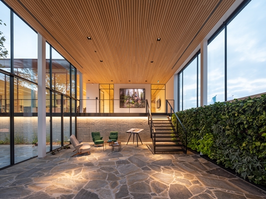 Met de kernwaarden van het bedrijf in gedachten is een ontwerp gemaakt met een pure hoofdvorm, natuurlijke ruimtelijkheid en kenmerkende materiaaltoepassing.