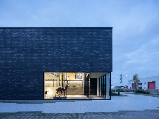 Het gebouw bestaat uit een donker vierkant volume van twee bouwlagen, dat in zijn eenvoud een krachtig antwoord geeft op de onuitgesproken omringende bedrijfsgebouwen. De gevel is grotendeels gesloten en uitgevoerd in een strakke dik-formaat baksteen. Daar waar het zinvol is voor het interieur zijn doorgaande, verdiepingshoge glasvlakken in de gevel opgenomen met ranke stalen kozijnen.