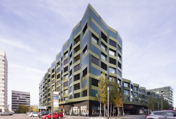 The building was to be designed for the centralBuilding Plot C on the site of a formerdye-works. The folded, relief-like façade, theuse of powerful colours and large areas ofglazing emphasise this central function. Thefaçade grid is a wickerwork pattern of broadinterwoven bands of ALUCOBOND