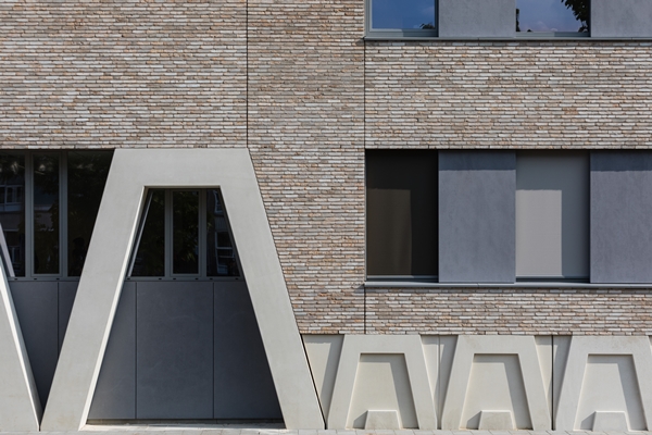 In de gevel verwijzen A-vormige prefab elementen naar de A van Augustinianum en de gevelelementen in het oorspronkelijke gebouw uit de jaren ’50.