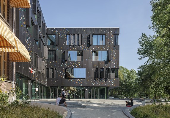 De gevel is voorzien van een opvallende, zwart geperforeerde panelen. Deze elektrisch bedienbare panelen fungeren als zonwering en zijn onderdeel van het kunstwerk ‘Here Comes The Sun’ van Chris Kabel. Hij heeft 4.500 transparante glazen lenzen en filters in diverse kleuren aan in deze panelen. De lichtinval zorgt hierdoor voor een diffuus speels lichteffect in de klaslokalen. Het patroon van de lenzen verwijst op een afstand van het gebouw naar het golf- en deeltjeskarakter van licht.