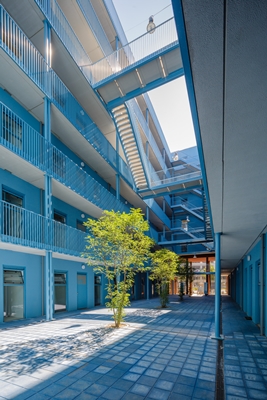De gevels zijn opgebouwd uit rood baksteen metselwerk en prefab kleurbeton in repeterende patronen, die zorgen voor een robuuste tijdloze architectuur. Een monumentale ‘fabriekspoort’ biedt toegang tot het centrale binnenhof. In tegenstelling tot het robuuste uiterlijk is het binnenhof kleinschalig en bijzonder ontworpen. Hier bevinden zich de galerijen met toegangen tot de woningen en stijgt een meanderende watervaltrap omhoog. Verbindende loopbruggen zorgen voor informele routes en nodigen uit tot sociale interactie tussen bewoners. Door het complete binnenhof in een uniforme hemelsblauwe kleur uit te voeren ontstaat een bijna mediterrane achtergrond die een oase van rust vormt binnen het dynamische Strijp-S.