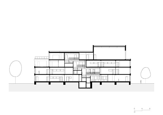 De keramische tegels vormen de banden van de gevel die het gebouw body geven. Tussen deze banden vormen het aluminium en het glas de lichte invulling. Door de hoeken en tegels in verstek te verlijmen en de hoekramen zonder hoekprofiel uit te voeren, zodat de glazen hoeken transparanter worden, ontstaat er nog meer contrast tussen de massieve band en de glazige invulling.
