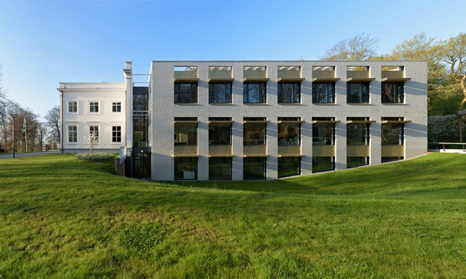 In samenwerking met NEXT architects is er een gebouw gerealiseerd, waarbij de nieuwbouw met haar moderne ‘basic’ karakter en natuurlijke materialen compositorisch inspeelt op het bestaande gebouw binnen de witte lichte omhulling. Het houdt enige afstand van het voorhuis waardoor een licht en transparant tussen lid ontstaat.