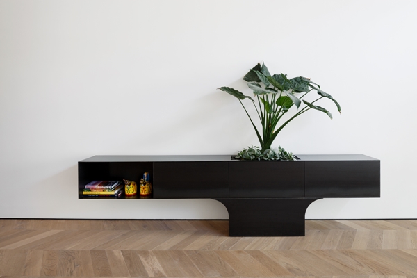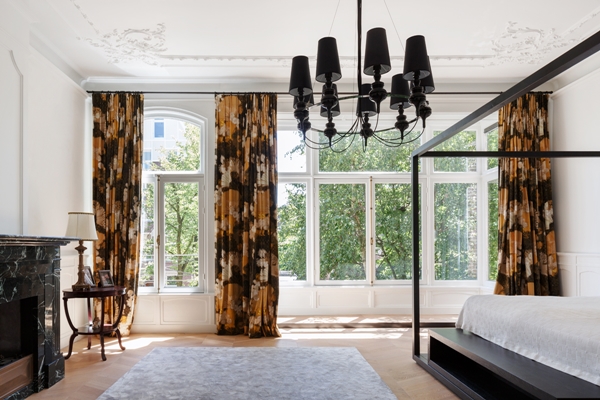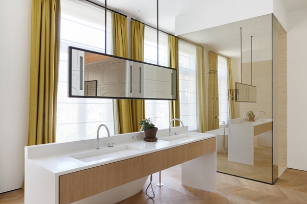 Hoe hoger in de woning hoe praktischer de ingreep. Op de bovenste verdiepingen liggen een kantoor, een nieuw terras en echte jongenskamers; de eerste verdieping is bestemd voor de ouders. Ook deze etage is in de lengte volledig geopend; de aanzienlijke badkamer met sauna aan de achterzijde en de monumentale slaapkamer aan de voorkant zijn met elkaar verbonden door een kleedruimte. Het ontwerpen van alle vaste en vrijstaande meubels boven behoorde eveneens tot de opdracht.