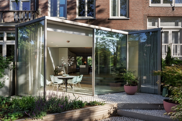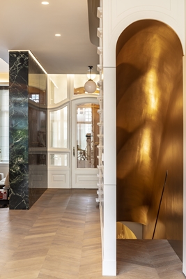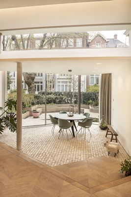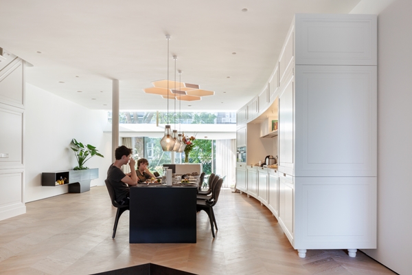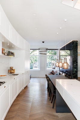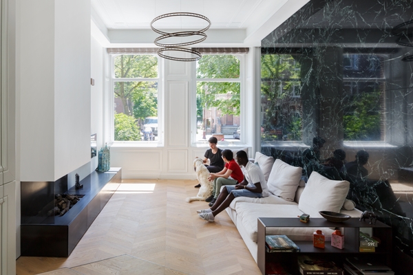 Het verhaal van dit riante familiehuis begint met de elementen die in 1905 met de grootst mogelijke toewijding zijn uitgevoerd; de ornamentale entree, trap, lambrisering en ornamentplafonds. Die karakteristieke details, tot voor kort grotendeels aan het zicht onttrokken door een indeling met gangen en kamers, zijn beeldbepalend geworden doordat de architecten de begane grond geheel openden. Visueel vormen woonkamer, keuken, lounge, tuinkamer en tuin nu een ononderbroken landschap. Daarop werd de sprong in de tijd versterkt door voor de bewoners meubels zoals keuken, haard, dressoir en tafels te ontwerpen die in kleur, vorm, materiaal en textuur complementair zijn aan de originele ornamenten. Eveneens contrasterend is de getande vorm van de hoogteverschillen en de uitbouw waar de voorliefde van de opdrachtgevers voor de houten vloer gelegd in Hongaarse punt de aanleiding voor was.