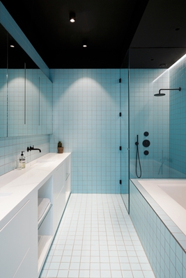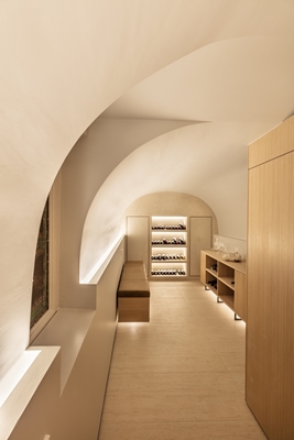 Beneden markeert een poortvormige doorgang onder de trap de route naar de kelder. Door de garderobe, het toilet en bergruimtes hier te situeren, vormden ze geen beperking bij het openen van de begane grond. De gewelfde kelder is van een lage, donkere installatieruimte door specifiek maatwerk en subtiele verlichting getransformeerd tot een exclusieve gebruiksruimte met een wijnkelder als eyecatcher.