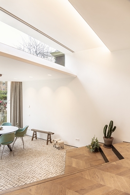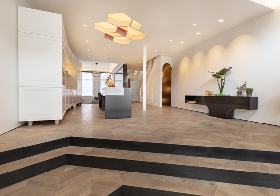 De conventionele indeling van dit 100 jaar oude, statige pand is rigoureus doorbroken. De begane grond is vormgegeven als een open landschap; 27 meter lang en met opeenvolgende sferen die worden versterkt door hoogteverschillen en georganiseerd rond specifiek ontworpen meubels. Door deze ingreep zijn de oorspronkelijke details in het interieur zichtbaar gemaakt wat het ambachtelijk karakter van de gehele renovatie bekrachtigt.