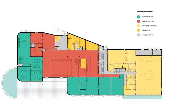 Ook functioneel zoekt de school verbinding met de buurt. De belangrijkste spil hierin zijn de bibliotheek en het eetcafé waar de buurt een hapje kan eten. De gymzaal, dansstudio en buurtruimte hebben een aparte entree en worden buiten schooltijd beschikbaar gesteld voor de buurt. Ook het speelterrein voor de school is openbaar.