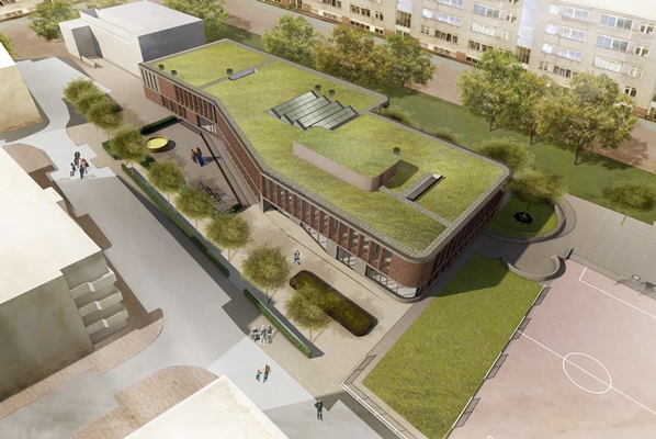 Groen dak op een stedelijke school. De nieuwe VMBO dat het bestuur voor ogen had, moest ‘het pareltje van de buurt’ worden. Een krachtige ambitie, waar de locatie in Kralingen, Rotterdam zich prima voor leent.
