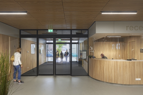 De bezoeker ziet meteen alles wat er te beleven valt. De aula, met een grote vide waar een tribunetrap in geplaatst is, vormt het hart van de school. Dit is ook de trots van projectleider Joost: “de tribunetrap met een zee van licht erboven geeft de ruimte vorm en wordt straks ongetwijfeld de favoriete hangout van de jongeren.” Hier omheen liggen praktijklokalen en het eetcafé. Boven zijn de leerpleinen gekoppeld aan theorielokalen. Ook het interieur is met zorg ontworpen. Veel wit en natuurlijke materialen creëren een prettige, rustgevende leeromgeving. We zoeken steeds naar functionele en mooie oplossingen, zoals de in het glas geëtste schilderijen die de functie van de lokalen tonen.