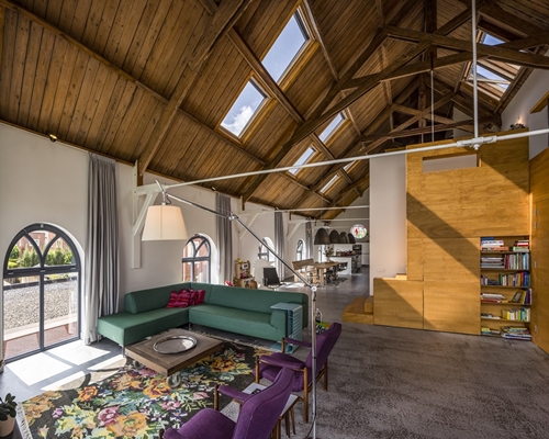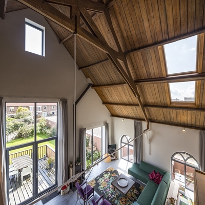 De lichtinval speelde een essentiële rol bij de transformatie. De kerk was weliswaar voorzien van (boog)ramen, maar deze zaten vrij laag voor de bewoners van de bovenwoning. Kampstra: “Omdat wij in feite onder de kap wonen, wilden we hier een grote, lichte ruimte creëren. Er zijn uiteindelijk tien VELUX dakramen geplaatst die hiervoor zorgen.