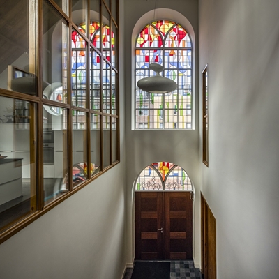 Aan de voorzijde van de kerk zit bovenin een groot glas-in-loodraam, eveneens ontworpen door Kampstra. “Dat zit in de gezamenlijke hal. We wilden dat de wand tussen de hal en ons huis volledig van glas zou zijn. Zo konden we optimaal profiteren van de lichtinval en genieten we nu vanuit onze keuken van dit licht uit de entree.”