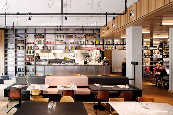 Een grote kast van sendzimir verzinkt staal scheidt de bar en de keuken van het zitgedeelte. Het neemt de hele breedte van de achterwand in beslag en verbindt daarmee de ruimten die deels van elkaar zijn gescheiden door drie betonnen kernen. Deze kernen zijn benut door het café-restaurant op te delen in verschillende zones: het café, het restaurant en een gedeelte met een leestafel. Boven de lange leestafel hangen lampen van de Arnhemse ontwerpster Paula Arntzen.