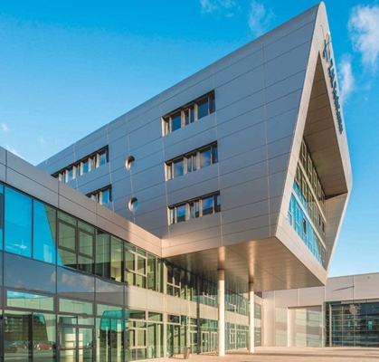 The complex reflects the ideas of technologyand transparency in its architecture. A brick façade was originally requested, but thearchitects selected a material which was more in tune with the function of the building and as means of creating a link to aerospace. The materials chosen were silver coloured ALUCOBOND
