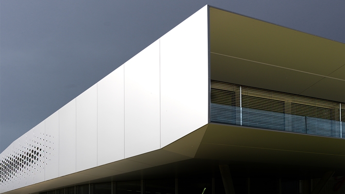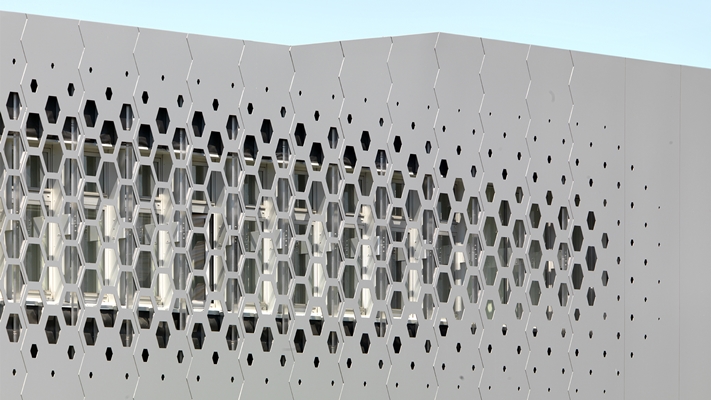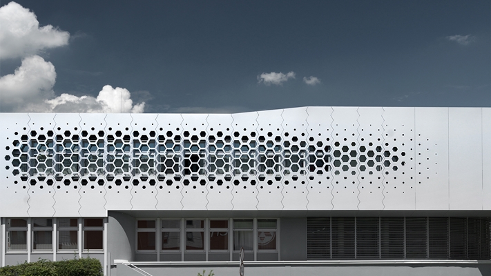 façade spanning the old and new parts of the complex and linking them seamlessly together. Using a computer-controlled process, the individual panels were prefabricated employing the most up-to-date methods and then installed with adhesive without additional fixing techniques. An LED lighting strip behind the hexagonal openings and running round the projecting volume makes the building radiant even in the dark – and guaranteed to turn heads. When planning the extension, the clients opted for the architecture company’s long experience coupled with the modern architectural style proposed by the company’s new generation, the sons who have become team members in the meantime. Combining experience with innovation is characteristic of the traditional Goldhaubenwebe company, which sees experience as the main stay of its success over the course of its 100-year plus history. The present owner took over the then small company at the age of twenty and laid the foundations for industrial clothing manufacture. He specialised in hospital textile requirements and textile rental companies have been part of his customer base for some fifty years.