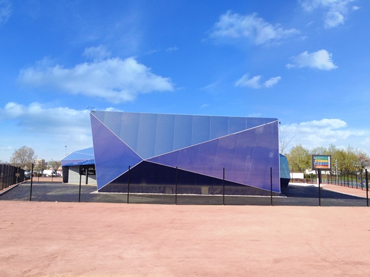 spectra Jewel. Illuminated at night with red lights, the volume is transformed into a light-flooded sculpture. The entrance is via a porch indicated by the red wall of the volume. This highly sculptural building is a top-quality recreation and pleasure location.