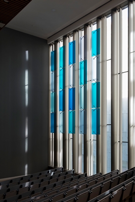 Ontmoeting staat in het interieurontwerp centraal. Het beeldmerk van de riante entree van de faculteit is een brede tribunetrap, waarmee de faculteit openbare debatten naar binnen wil halen. Deze trap voert naar de tweede verdieping, waar men boven komt in het restaurant. Om zoveel mogelijk kansen te bieden voor menselijke interactie is op de tweede en derde verdieping een ‘free flow’ gebied gecreëerd. Besloten onderwijsruimten worden afgewisseld met een meanderend landschap van studieruimten rond de centrale binnentuin. Dit landschap biedt een diversiteit aan allerlei soorten studieplekken. Er zijn ook stillere plekken, waar in alle rust gestudeerd kan worden. Door de ‘free flow’ opzet over de volledige diepte van het gebouw kan het daglicht ver doordringen en is er altijd zicht op de binnentuin, die het Campusgevoel versterkt.